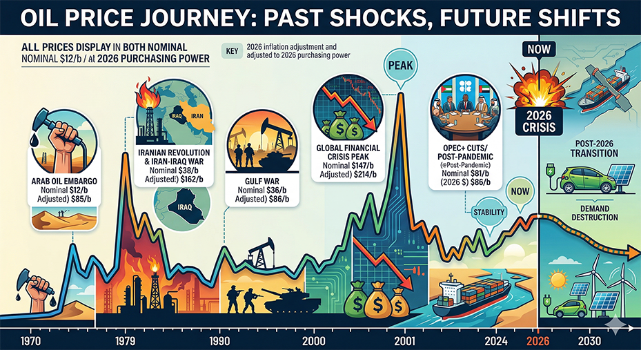 The Takeaway: While we haven’t yet reached the inflation-adjusted peak of 2008, the 2026 crisis is unique because it may be the last time oil has the power to shock the global economy before the energy transition takes full hold.
